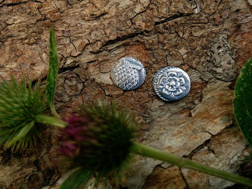 Beautiful English Tudor rose on one side and a bristling Scottish thistle on the other. James used these symbols on his coins to illustrate the "Union of the Crowns". For the first time in history, England, Ireland, and Scotland were united and ruled by the same king.
